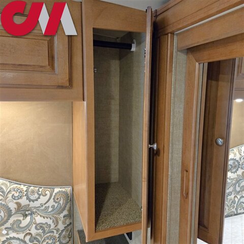 Head back to the rear and find a private bedroom with sliding door. Inside there is a walk-around queen bed with shirt closet and nightstand, plus overhead storage, and a slide out wardrobe, plus the chest of drawers mentioned above.