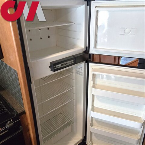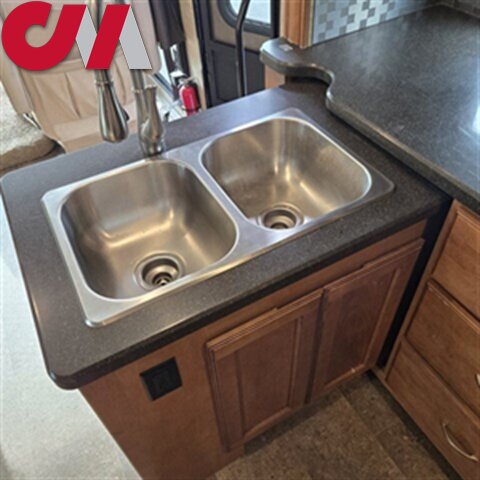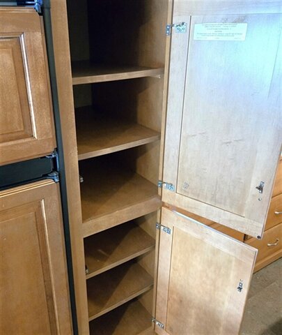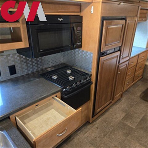 To the left of the entry door find a large wall slide featuring the kitchen appliances, and chest of drawers inside the bedroom. The L-shaped counter features a double kitchen sink, overhead storage, a three burner range, refrigerator, and a pantry.
