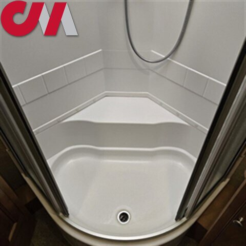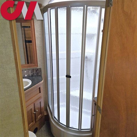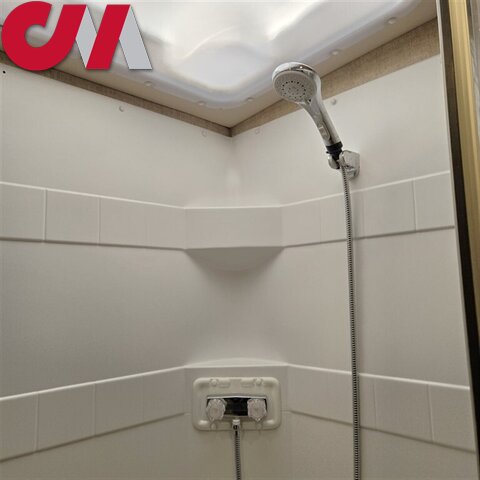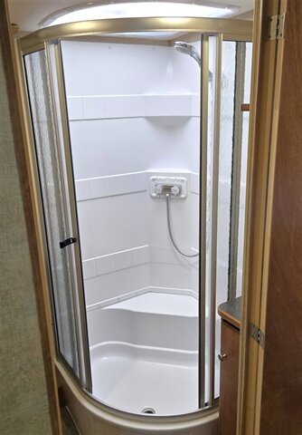 A convenient bath is located in the center of the coach and features a kidney shaped shower, corner sink, toilet, and storage cabinet.